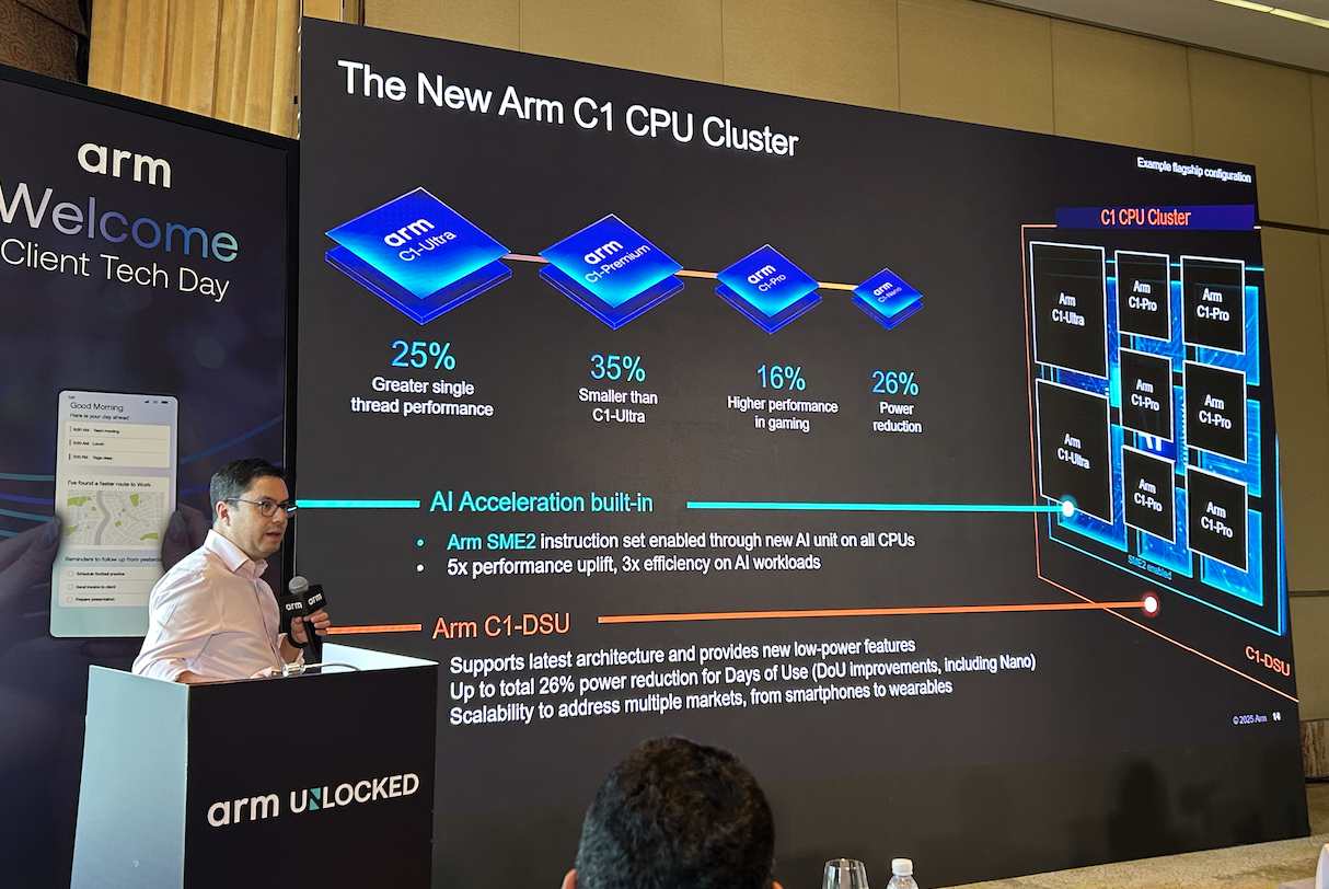在近日的Arm Unlocked大會上,Arm Lumex CSS 平臺及其所集成的C1 CPU集群、第二代 Arm 可伸縮矩陣擴(kuò)展 (SME2) 及Mail-G1-Ultra GPU等創(chuàng)新技術(shù)發(fā)布,或可看作Arm推動移動終端邁向全面AI計(jì)算的關(guān)鍵節(jié)點(diǎn)。