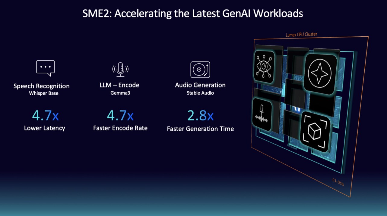 Chris Bergey則在主題演講中強(qiáng)調(diào),SME2全面集成于Arm Lumex的Arm C1 CPU集群中,相較于未啟用SME2的基準(zhǔn),性能提升3至6倍。具體而言,SME2在語音識別任務(wù)中將延遲縮短超4.7倍,經(jīng)典大語言模型任務(wù)性能提升4.7倍,生成式AI處理速度加快2.8倍。對于傳統(tǒng)AI任務(wù)(如圖像分類、分割和深度估計(jì)),SME2在小型模型上的表現(xiàn)尤為突出,甚至超越專用GPU的性能。Chris Bergey還提到,SME2通過與KleidiAI軟件的協(xié)同優(yōu)化,確保主流AI框架(如LiteRT)能夠無縫利用CPU的增強(qiáng)能力,從而提升開發(fā)者在Android和iOS生態(tài)中的開發(fā)效率。