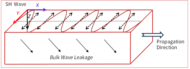 圖2 Normal-SAW 工作的波模式: SH Wave (水平剪切波),又稱Leaky Wave (漏波)