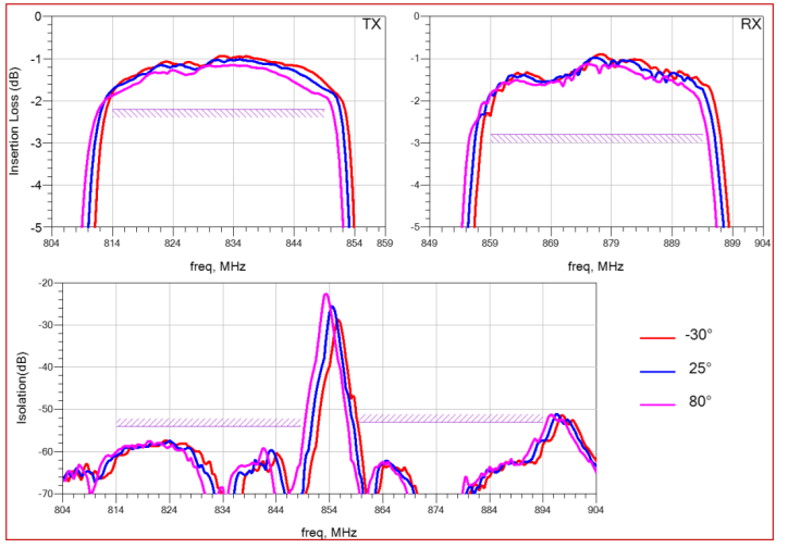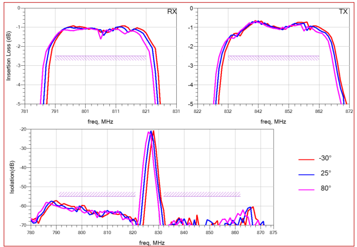 圖12 新聲半導(dǎo)體NS73226A,Band26 TC-SAW雙工器全溫插損及隔離性能(1612尺寸)