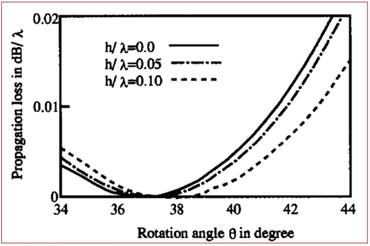 圖5 Normal-SAW傳播聲損耗與襯底材料切型的關(guān)系。對于無限薄的鋁電極,Normal-SAW最小聲損耗襯底切角是36.75° ,隨著鋁電極厚度增加,該角度逐漸向右移[3]