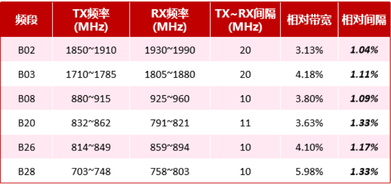 表1 Tx~Rx頻率間隔極小的頻段