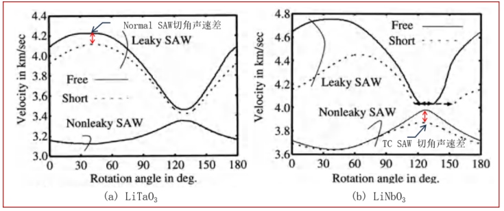 圖8 Leaky SAW (SH Wave),Nonleaky SAW(Rayleigh Wave)波速與襯底轉(zhuǎn)角的關(guān)系。圖中實(shí)線對應(yīng)自由表面,虛線對應(yīng)帶有金屬電極的短路表面,兩者的波速差可以得出 K2≈2×(νo-νs)/νo [4] : (a) 鉭酸鋰的Nonleaky SAW 波速差幾乎為0,只有Leaky SAW的波速差可以達(dá)到多數(shù)頻段 K2需求;(b)鈮酸鋰的Nonleaky SAW的波速差在128°附近達(dá)到最高,滿足多數(shù)頻段的 K2需求[2]