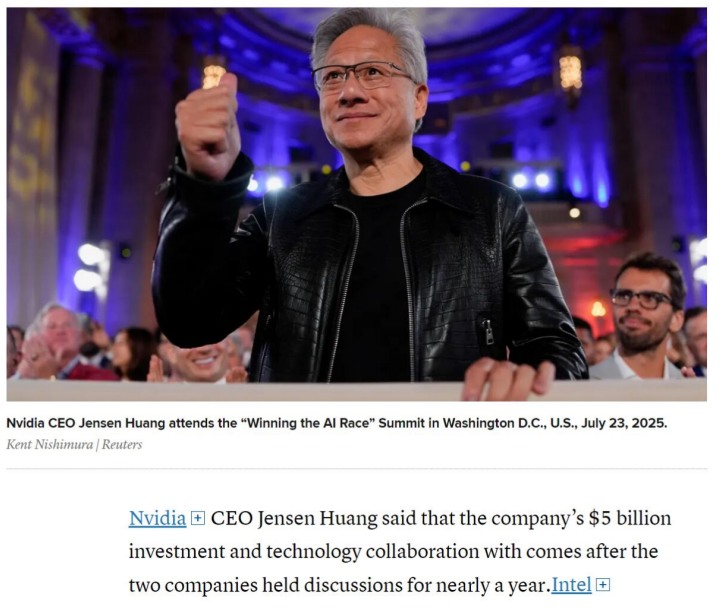 此舉標(biāo)志著兩大競爭對手聯(lián)手,開創(chuàng)AI PC和數(shù)據(jù)中心合作新篇章。消息公布后,英特爾股價在周四盤前交易飆升29%。而在交易前一個月,美國政府統(tǒng)一購入英特爾10%的股份,美國政府希望確保國家芯片業(yè)的未來。