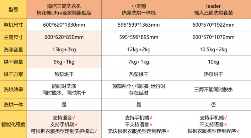 而市面眾多三筒洗衣機中,海信洗衣機推出的棉花糖Ultra全家筒旗艦版(WH130U9Q+WV20G-H/WH130U9Q-1+WV20W)、小天鵝熱泵洗烘、Leader懶人三筒洗烘套裝,同樣都是搭載熱泵烘干系統(tǒng)的“高配”三筒洗衣機,到底誰能真正契合“懶人”需求,成為他們的“夢中情機”?