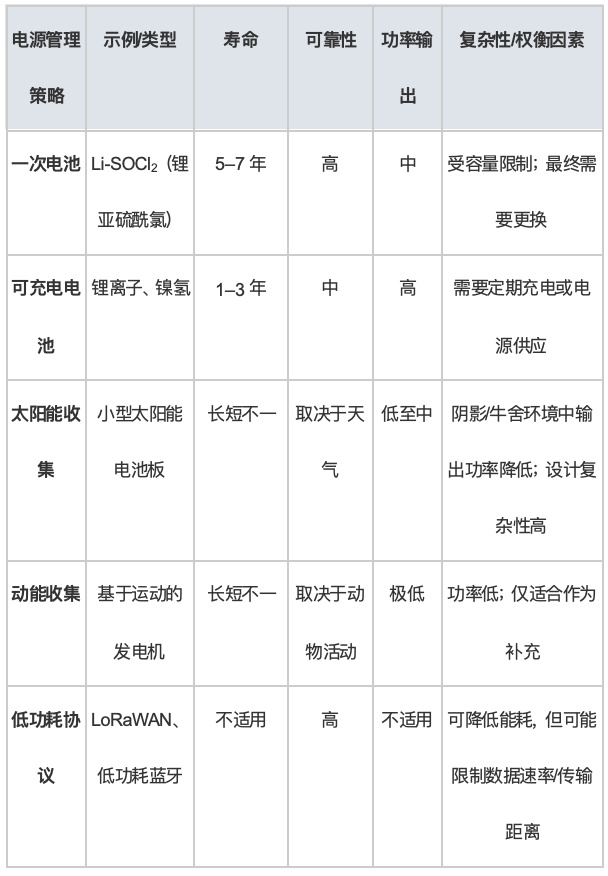 電源管理無疑是牲畜物聯(lián)網(wǎng)設(shè)計(jì)中最關(guān)鍵的挑戰(zhàn),而養(yǎng)殖戶們對(duì)此深有體會(huì)。工程師必須權(quán)衡電池類型、能量收集和低功耗協(xié)議(表3)。與每天都可以充電的消費(fèi)級(jí)可穿戴設(shè)備不同,牛用傳感器預(yù)計(jì)需要在好幾年不更換電池的情況下持續(xù)工作。設(shè)備失效不僅意味著數(shù)據(jù)丟失,更意味著錯(cuò)失健康預(yù)警、增加人工成本,以及對(duì)技術(shù)的信任度下降。這些設(shè)備的目標(biāo)是實(shí)現(xiàn)真正“安裝后無需打理”的運(yùn)行模式,也就意味著要從硬件、固件和通信間隔中榨取每一滴效率,甚至探索能量收集技術(shù)。