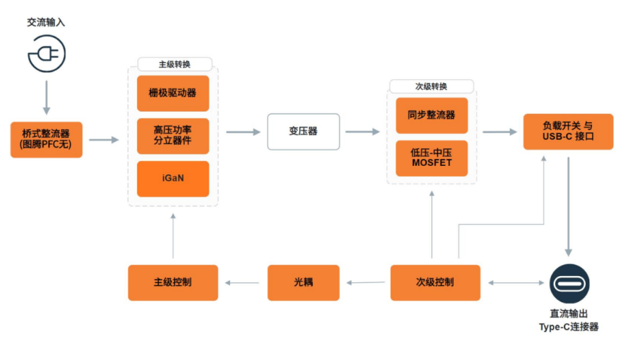 下面的框圖展示了安森美(onsemi)設(shè)計的 USB-C 電池充電器解決方案。 該圖說明了 USB-C 電池充電器中使用的電源管理和電源轉(zhuǎn)換技術(shù)。 采用的元件包括 TP PFC 控制器、 高頻準(zhǔn)諧振反激/LLC 控制器、 柵極驅(qū)動器、 同步整流電路, 以及 iGaN 和 MOSFET 器件。 這些元件被分為初級側(cè)和次級側(cè)兩個部分, 以提升系統(tǒng)效率。 如以下器件表所示, 大部分功能模塊器件均可采用安森美解決方案。