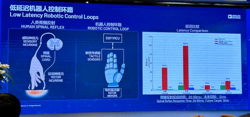 類人靈巧的另一關(guān)鍵是低延遲控制,類似人類的“脊髓反射”(20-50ms)。機器人需將控制環(huán)路延遲壓縮至10-20ms以內(nèi),涵蓋感知、處理、通信和驅(qū)動四個環(huán)節(jié)。ADI的解決方案包括:快速響應(yīng)磁觸覺陣列(1ms)、邊緣AI芯片(實時推理)、GMSL3(12Gbps傳輸,較6Gbps的GMSL2更快)、高響應(yīng)電機驅(qū)動。以松延動力機器人為例,其空翻動作依賴毫秒級傳動比和能量回收,ADI的低延遲技術(shù)是幕后推手。