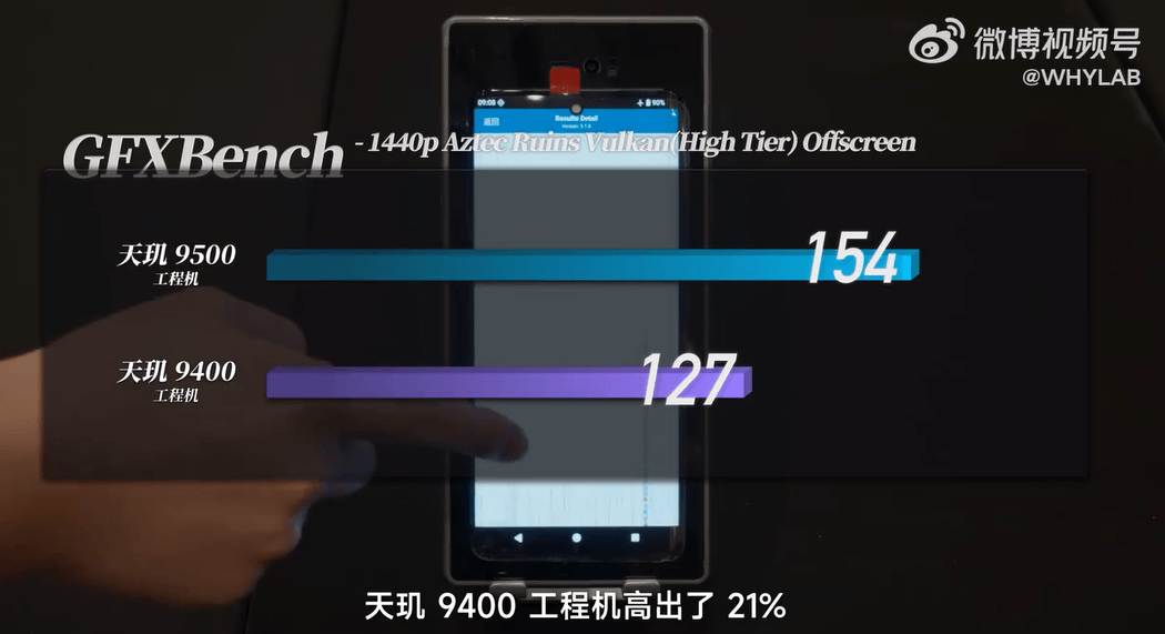 第三方實測同樣給力:WHYLAB在GFXBench 1440P Aztec Ruins離屏測試中拿到154幀,相比天璣9400提升21%;