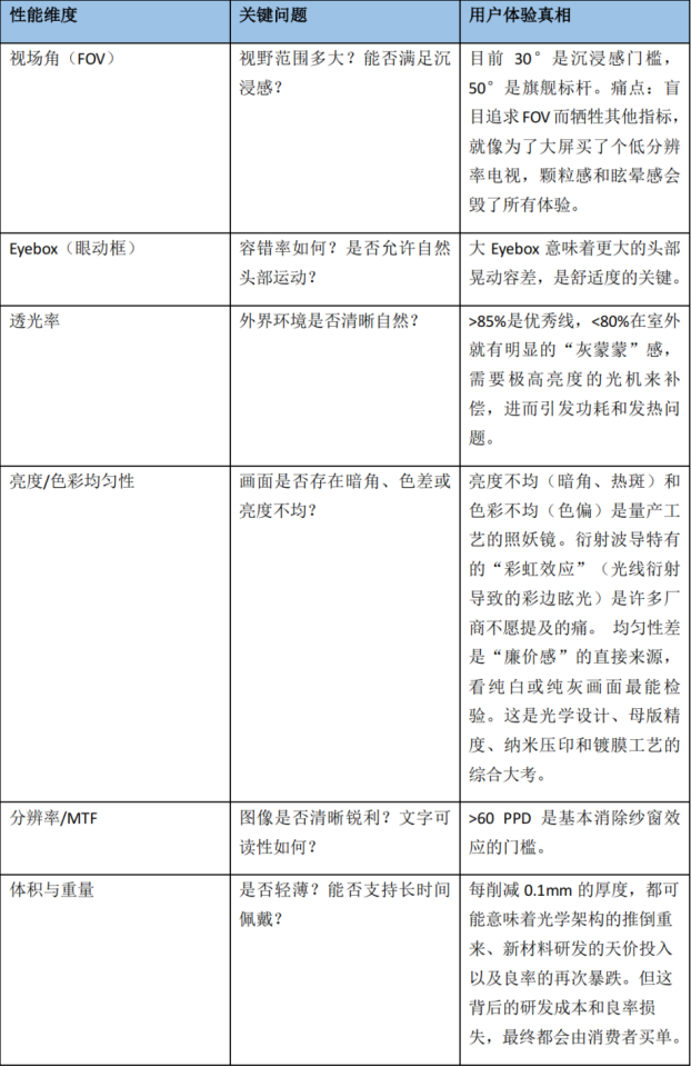 我們不僅看數(shù)字,更關注這些參數(shù)如何影響實際使用體驗。以下是衡量光波導性能的六大關鍵維度: