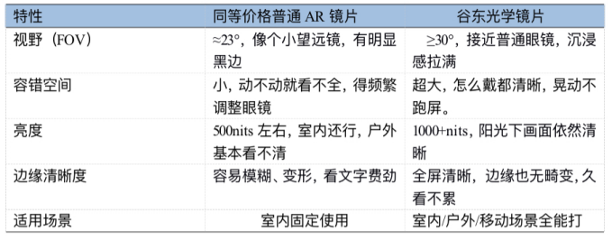 在千元級AR眼鏡光學方案的激烈戰(zhàn)場上,「性價比」早已不是新鮮口號。但當真正將谷東光學與同價位產(chǎn)品置于參數(shù)對比表格中時,技術差距仍然清晰的令人驚訝——這不是迭代,是架構級的跨越。