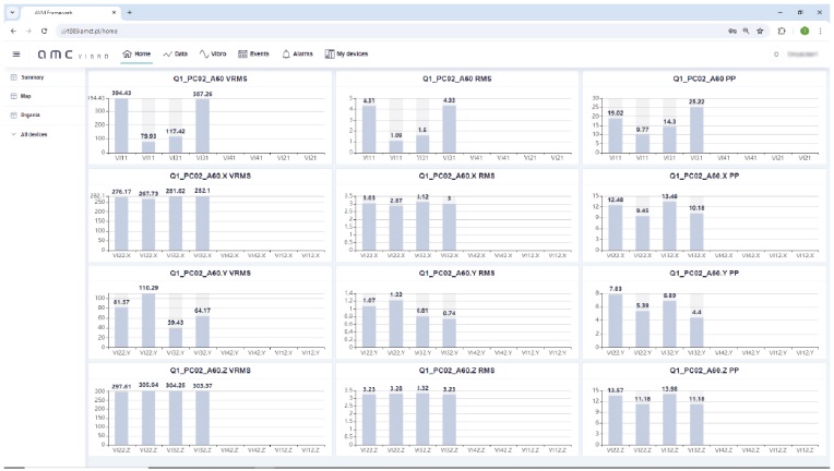 AVS 1001HF與AVS 1003LF加速度計(jì)已整合至AMC云端狀態(tài)監(jiān)控系統(tǒng)中。傳感器采集的原始信號(hào)傳輸至邊緣處理單元,計(jì)算出診斷特征后,再將數(shù)據(jù)發(fā)送至云服務(wù)器??蛻艨煽焖俦憬莸孬@取有關(guān)機(jī)械健康狀態(tài)的信息。系統(tǒng)提供的圖表包括:設(shè)備分布圖、自定義模擬圖(含柱狀圖等多種組件)、報(bào)警信息、趨勢(shì)圖、波形圖、頻譜圖等。圖4展示了系統(tǒng)提供的部分圖表。