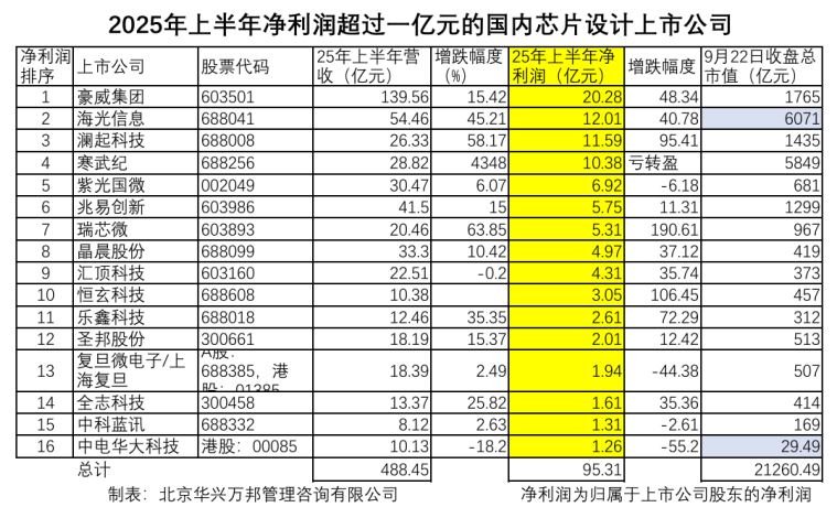 隨著8月29日休市后在香港上市的中國電子華大科技有限公司(港股代碼:00085)公布其2025年中期業(yè)績公告,2025年上半年“歸屬上市公司股東凈利潤”超過一億元的國內(nèi)芯片設(shè)計(jì)上市公司基本浮出水面。根據(jù)北京華興萬邦管理咨詢有限公司的統(tǒng)計(jì),目前共有16家上市芯片設(shè)計(jì)公司半年凈利潤過億,加上還有華為海思半導(dǎo)體、紫光展銳和國網(wǎng)智芯等多家有規(guī)模但未上市的芯片設(shè)計(jì)企業(yè),他們的半年凈利潤也有可能超過了億元,所以國內(nèi)有20家左右芯片設(shè)計(jì)企業(yè)在今年上半年盈利過億。他們?cè)谖覈?000多家芯片設(shè)計(jì)企業(yè)中盈利能力排在了前3%,因而其中每一家都值得大家去關(guān)注和分析。