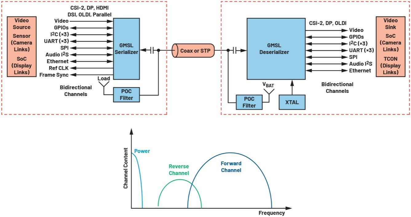 從圖13和圖15可見,GMSL SERDES的視頻接口和控制接口直接與圖像傳感器和LCD面板相連,省去了微控制器(MCU)、視頻編解碼器、RS-485/RS-232收發(fā)器及其他連接器。此外,GMSL SERDES解決方案還具備多項優(yōu)勢:更大的視頻帶寬、超低且確定性的視頻延遲、極為簡化的硬件設計,而且僅需一根低成本同軸電纜或屏蔽雙絞線(STP)就能實現(xiàn)外部連接。