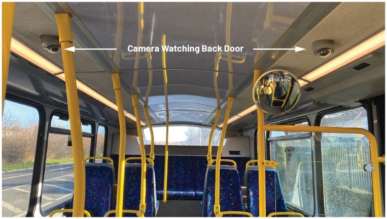 圖3.公交車車載安防系統(tǒng)示例,展示了監(jiān)控后門的攝像頭。