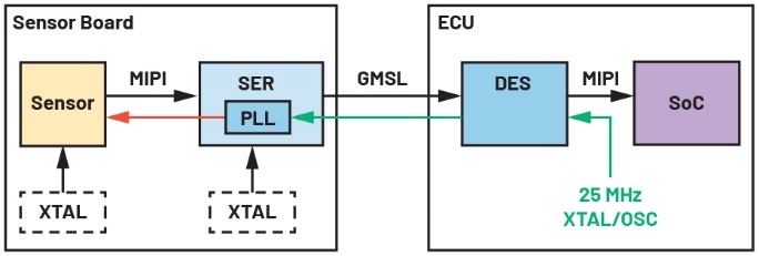 MAX96717/MAX96793系列支持反向通道參考時鐘(RoR),即由解串器通過反向通道傳輸?shù)臅r鐘,使得傳感器板可省去晶體振蕩器(圖14)。RoR省去晶體振蕩器后,能帶來多重優(yōu)勢:降低系統(tǒng)成本、提升可靠性、減少晶體振蕩器使用量,同時簡化電路板布局。