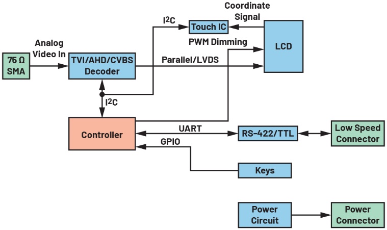 通過I2C接口連接的控制器負責處理這些數(shù)字數(shù)據(jù),是多個關鍵通路的樞紐。它直接與LCD顯示屏及其觸控集成電路(IC)通信,通過脈沖寬度調制(PWM)調光來控制亮度等,并處理來自觸控面板的輸入。