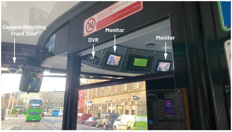 圖2.公交車車載安防系統(tǒng)示例,展示了駕駛座攝像頭、數(shù)字錄像機(DVR)和監(jiān)視器。