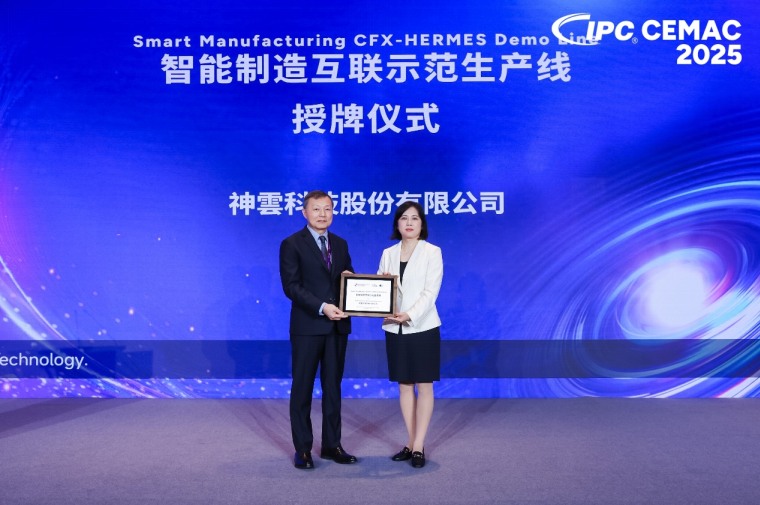 9 月 25 日,在2025 IPC CEMAC 電子制造年會“電子制造的數(shù)智化轉(zhuǎn)型升級”論壇上,神達(dá)電腦股份有限公司(MiTAC International Corp.)與神雲(yún)科技股份有限公司(MiTAC Computing Technology Corp.)推動建設(shè)的 SMT 生產(chǎn)線,因全面導(dǎo)入 IPC-CFX (Connected Factory Exchange,IPC-2591)與IPC-HERMES-9852 (HERMES)標(biāo)準(zhǔn),獲頒“智能制造互聯(lián)示范生產(chǎn)線”榮譽。頒證儀式上,全球電子協(xié)會東亞區(qū)總裁 肖茜 女士為神達(dá)電腦數(shù)位發(fā)展中心資深副總 姜易成 授證。