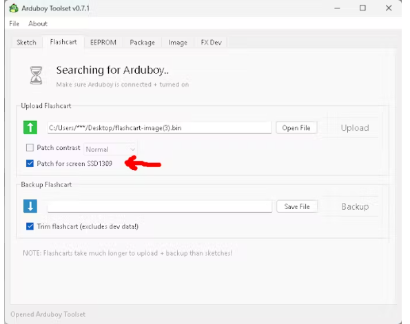 確保選擇了SSD1309屏幕補(bǔ)丁,然后將游戲上傳到megapoket上的閃存芯片上。