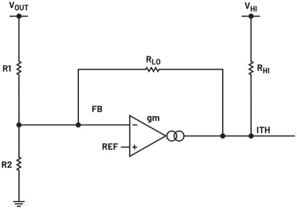 圖2顯示AVP串聯(lián)補(bǔ)償電路。內(nèi)部基準(zhǔn)電壓(VREF)和VOUT反饋分別連接到誤差放大器的正輸入和負(fù)輸入。與RHI連接的VHI(或INTVCC)向放大器輸出(ITH或COMP)提供適當(dāng)?shù)闹绷麟妷?,以防止輸出進(jìn)入飽和狀態(tài)。RLO(反饋電阻)位于輸出(ITH)和負(fù)輸入(或FB)之間。因此,RLO決定了gm放大器增益。RHI和RLO值應(yīng)遠(yuǎn)高于R1和R2。