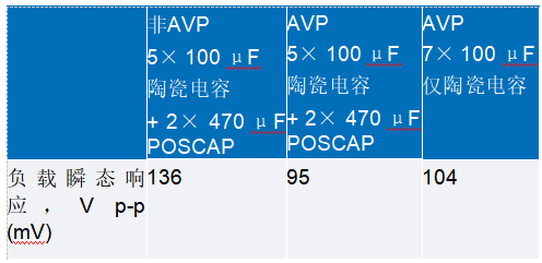 表1顯示了上述測(cè)量的非AVP(基準(zhǔn))、AVP和僅使用輸出陶瓷電容的AVP的負(fù)載瞬態(tài)響應(yīng)V p-p,以供比較。