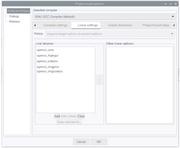 進入菜單Project——> Build Options,在鏈接器設置中添加以下庫