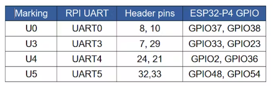 在Waveshare的ESP32-P4板上,ESP32-P4的UART0連接到擴展頭的8和10引腳(在Raspberry Pi的GPIO14和15 - UART0上)。但與此同時,這些引腳還在板上連接UART-USB橋接進(jìn)行編程調(diào)試,使這些引腳無法使用。相反,我們可以為樹莓派的其他uart使用替代引腳: