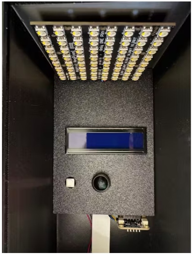 外殼由兩部分組成:“盒子”和電子外殼。兩者都是用ABS打印的,以承受高溫。LED陣列通過(guò)支架安裝在盒子的頂部。24號(hào)連接線通過(guò)外殼連接到電源板。液晶顯示器、二氧化碳傳感器和攝像頭被壓入電子外殼上略顯小的切口。勒克斯光傳感器安裝在機(jī)箱的底部。顯示器,CO2和lux傳感器使用短QT電纜相互連接。這些電纜,連同攝像機(jī)帶線和LED電纜通過(guò)外殼和“盒子”的底部插槽布線。該外殼適合對(duì)后方的盒子,并通過(guò)在每一邊螺絲舉行的地方。