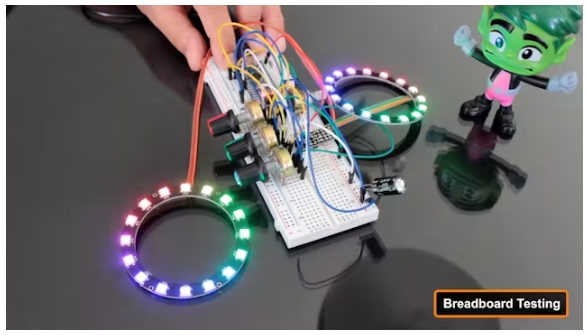 在將所有內(nèi)容放入機箱之前,我將它們連接到面包板上以測試代碼。當我打開電源時,你可以看到NeoPixel環(huán)播放一個小彩虹動畫,然后它們就準備好了?,F(xiàn)在,當我轉(zhuǎn)動這些旋鈕,當Arduino讀取電位器值并實時更新led時,顏色會平滑地變化。
