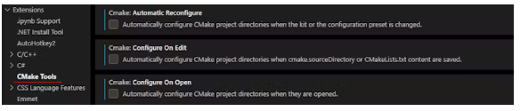 在擴展→CMake工具部分,找到并禁用三個選項,如圖所示。