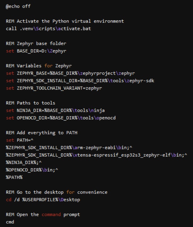 我們不修改系統(tǒng)的全局環(huán)境變量,而是創(chuàng)建一個方便的zephyr-env。在D:\Zephyr文件夾中的cmd腳本,它將“動態(tài)”配置我們的整個環(huán)境。