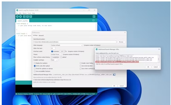 這個時鐘使用NTP(網(wǎng)絡(luò)時間協(xié)議)在互聯(lián)網(wǎng)上同步時間。為了演示按鈕的功能,我擴展了代碼以數(shù)字格式顯示時間和日期,并更改了背景顏色。為了制作這個可愛的時鐘項目,我們不需要任何外部組件或焊接,所以它適合初學(xué)者。讓我簡要解釋一下如何在Arduino IDE中安裝對Unihiker K10的支持。讓我提醒你,Arduino IDE版本必須是1.8.19或更早。