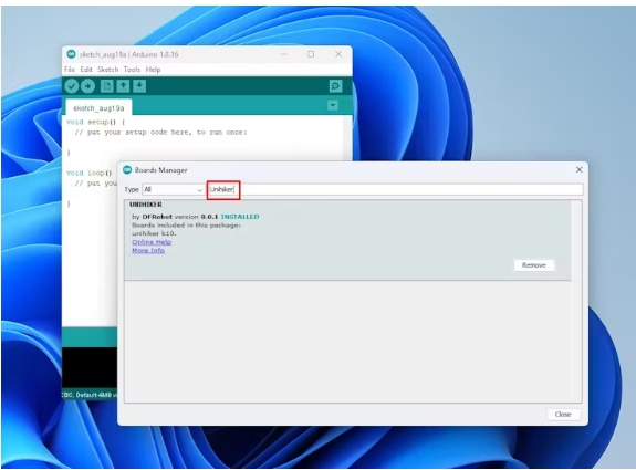 然后在Tools-> Boards Manager中編寫Unihiker,并安裝了DFRobot對Unihiker的支持。