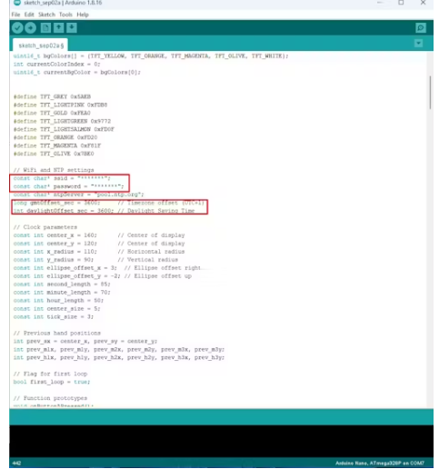 首先,你需要輸入你的Wi-Fi證書,你所在的時區(qū)和夏令時。然后將代碼分成幾個獨立的、易于理解的函數(shù),您可以在其中更改各種參數(shù),如果您有時間和愿望,還可以創(chuàng)建自己的時鐘面。