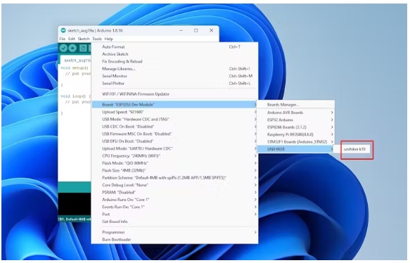現(xiàn)在我們點擊工具-> Unihiker -> Unihiker K10。