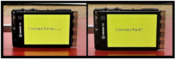 現(xiàn)在讓我們看看該設(shè)備在實際條件下是如何工作的。打開后,立即出現(xiàn)有關(guān)Wi-Fi可用性的信息,如果連接成功,則顯示上出現(xiàn)一個帶有黃色背景的橢球模擬時鐘,如代碼中定義的那樣。