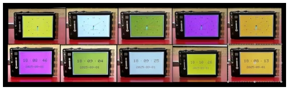 時鐘包含一個顯示小時的彩色箭頭,一個空箭頭表示分鐘,一個細(xì)紅色箭頭表示秒。日期寫在下半部?,F(xiàn)在按下A鍵,下一個屏幕出現(xiàn),它以數(shù)字格式顯示時間和日期。使用B按鈕,我們可以更改之前為時鐘背景定義的幾個顏色。