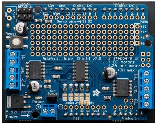 Adafruit電機(jī)屏蔽是一種可堆疊的電機(jī)屏蔽,最多允許使用單個(gè)屏蔽控制2個(gè)伺服電機(jī),4個(gè)直流電機(jī)或2個(gè)步進(jìn)電機(jī)。通過為我們的要求配置屏蔽,可以根據(jù)需要控制電機(jī)。在本教程中,控制一個(gè)伺服電機(jī),一個(gè)直流電機(jī)和一個(gè)步進(jìn)電機(jī)作為概念證明。