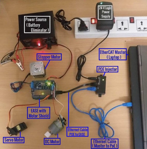 使用EtherCAT主機(jī)與Arduino上的Esmacat(EASE)的EtherCAT Arduino Shield進(jìn)行通信,以使用電機(jī)屏蔽控制電機(jī)。