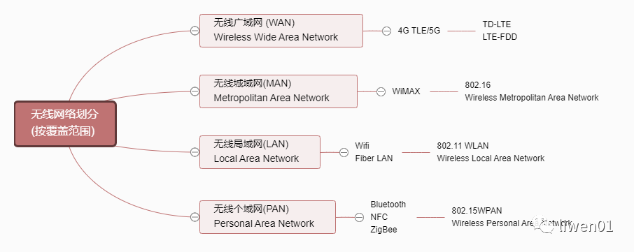 按照覆蓋范圍,無線網(wǎng)絡可以分為廣域網(wǎng),城域網(wǎng),局域網(wǎng)和個域網(wǎng)。