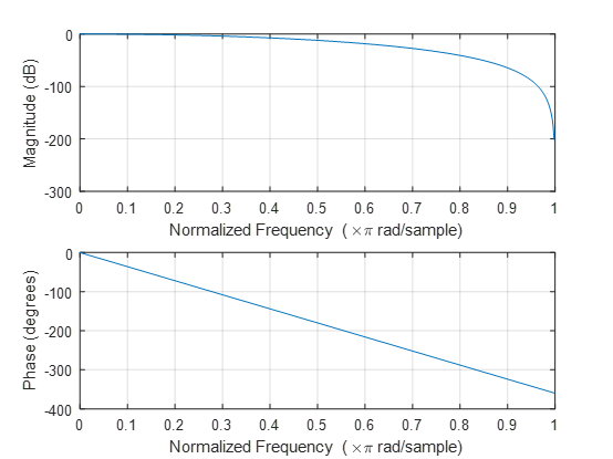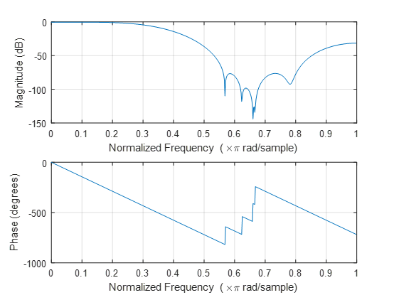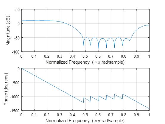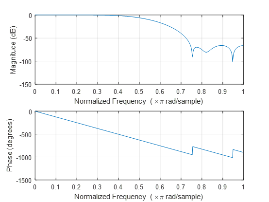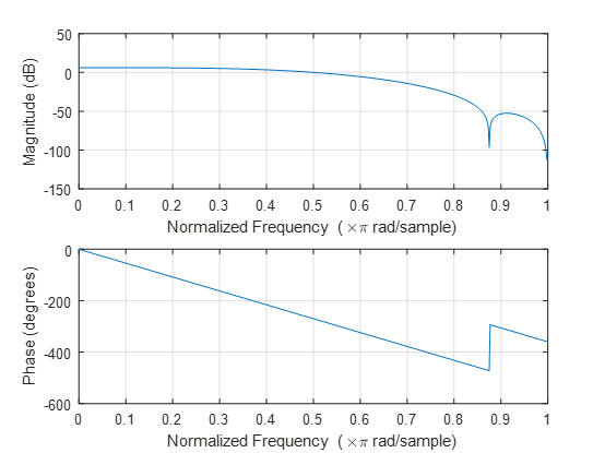 第三級(jí)HB2也是一個(gè)固定2倍插值低通濾波器,系數(shù)為[?9, 0, 73, 128, 73, 0, ?9]。其幅頻相應(yīng)如圖6-3所示。