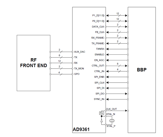 AD9361主要的接口有SPI、數(shù)據(jù)端口P0_D、P1_D、DATA_CLK、FB_CLK、TX_FRAME、RX_FRAME、ENABLE、TXNRX。