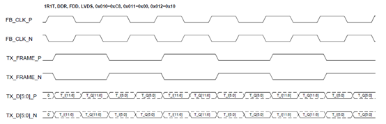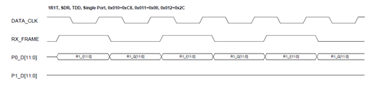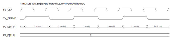 CMOS模式下,所有接口信號(hào)都是單端信號(hào)。在此電平模式下,允許兩組12bit端口P0_D、P1_D并行使用,即允許雙端口時(shí)序。CMOS模式下,單端口信號(hào)TX時(shí)序如圖7-2,RX時(shí)序如圖7-3; P0/1_D和T/Rx_D_P/N的對(duì)應(yīng)關(guān)系可參見硬件連接的spec。