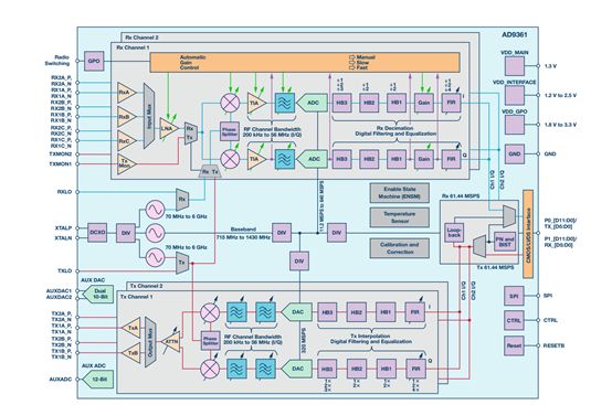 AD9361是ADI推出的面向3G和4G基站應(yīng)用的高性能、高集成度的射頻解決方案。該器件集RF前端與靈活的混合信號(hào)基帶部分為一體,集成頻率合成器,為處理器提供可配置數(shù)字接口。AD9361接收器LO工作頻率范圍為70 MHz至6.0 GHz,發(fā)射器LO工作頻率范圍為47 MHz至6.0 GHz,涵蓋大部分特許執(zhí)照和免執(zhí)照頻段,支持的通道帶寬范圍為200 kHz以下至56 MHz。