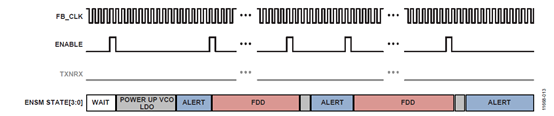 FDD模式下,TX、RX頻率綜合器會(huì)在兩種情況下進(jìn)行校準(zhǔn),一是ENSM從WAIT->ALERT時(shí),二是頻率控制字寫入時(shí)。而在FDD狀態(tài)下,校準(zhǔn)結(jié)果是保持不變的。