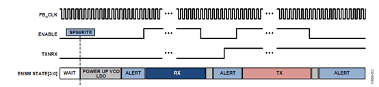 為了節(jié)省功耗,TDD模式下,T/Rx的VCO并一直保持鎖定狀態(tài),在RX使能時(shí),TX VCO會(huì)關(guān)閉,反之亦然。當(dāng)TXNRX改變時(shí),再對(duì)當(dāng)前使能的VCO重新校準(zhǔn)。因此在使用時(shí),ALERT狀態(tài)下應(yīng)該盡早跳轉(zhuǎn)TXNRX來為VCO校準(zhǔn)爭(zhēng)取最大時(shí)間。