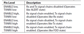 而本小節(jié)的FDD Independent模式便支持收發(fā)開關(guān)獨(dú)立控制,功能開關(guān)是ENSM Config2 D7比特。功能開啟后,可通過TXNRX、ENABLE共同控制TX、RX的開啟關(guān)閉,控制邏輯如表8-3所示。