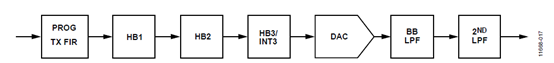 TX濾波器通路總體分為3級(jí)數(shù)字濾波器和兩級(jí)模擬濾波器,示意圖如下圖6-1所示: