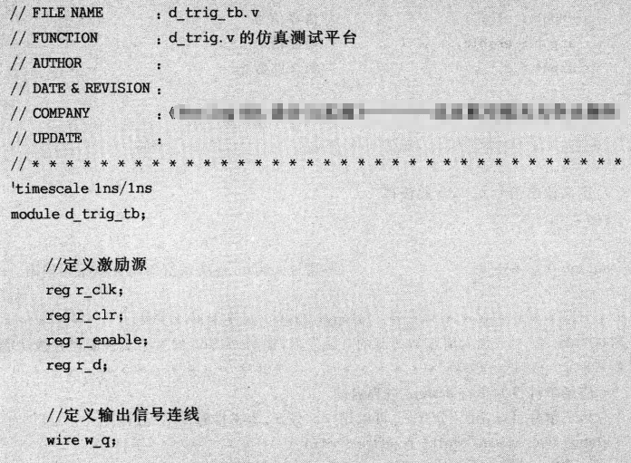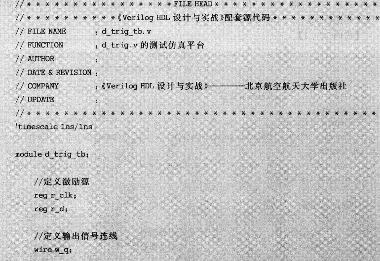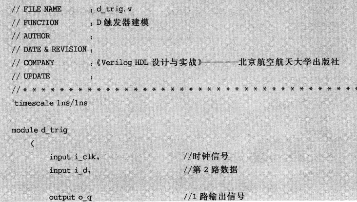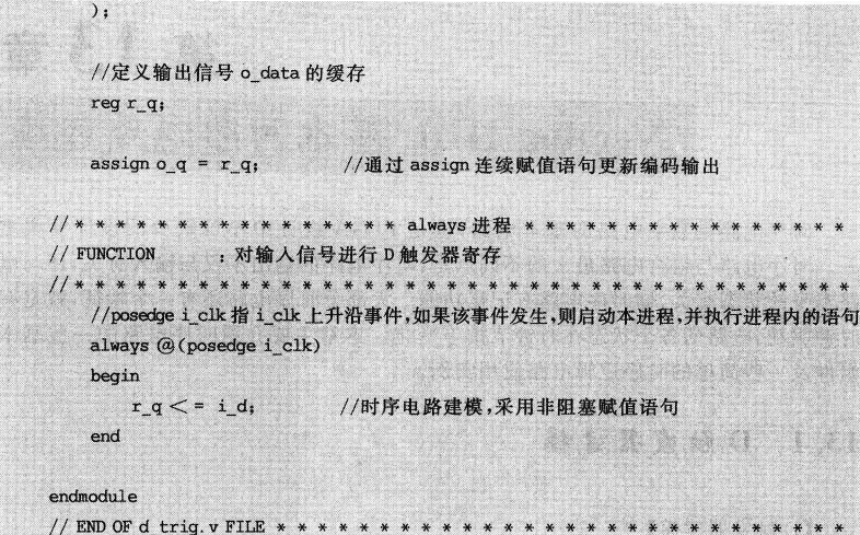D觸發(fā)器是時(shí)序電路最基本的組件之一,其基本功能是:輸出端Q的更新只發(fā)生在時(shí)鐘信號(hào)的上升沿(也可以是下降沿,在沒有其他說明的情況下,例子中取上升沿)時(shí)刻,更新為此時(shí)輸人端D的信號(hào)。D觸發(fā)器的Verilog HDL編碼的實(shí)現(xiàn)比較簡單,具體實(shí)現(xiàn)如【代碼13-1】所列。
